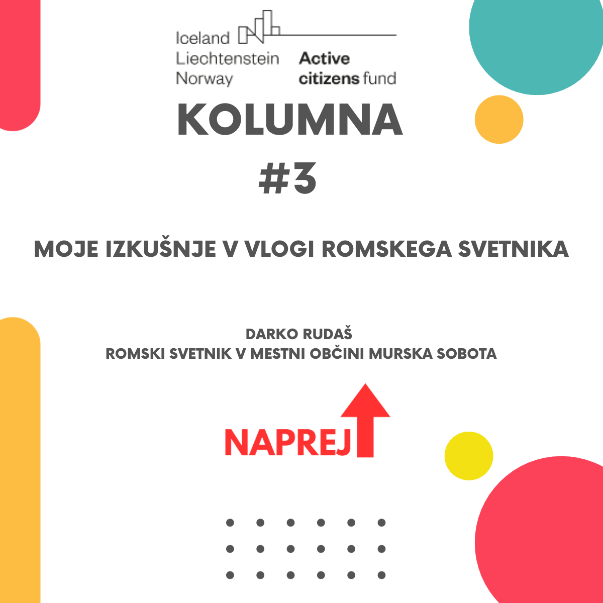 V okviru projekta NAPREJ je tretja kolumna namenjena raziskovanju vloge romskega svetnika v lokalnem okolju. V tej številki delimo misli Darka Rudaša, izkušenega romskega svetnika v Mestni občini Murska Sobota, ki se ponaša s kar 30 leti izkušenj na področju razvoja romske skupnosti. Darko Rudaš, poleg svoje vloge romskega svetnika, uspešno opravlja tudi funkcijo predsednika Foruma romskih svetnikov Slovenije ter je aktivno vpet v delovanje Zveze za razvoj romske manjšine - Preporod. Poleg tega je pomemben sodelavec Razvojnega centra Murska Sobota, na področju razvoja romske skupnosti.