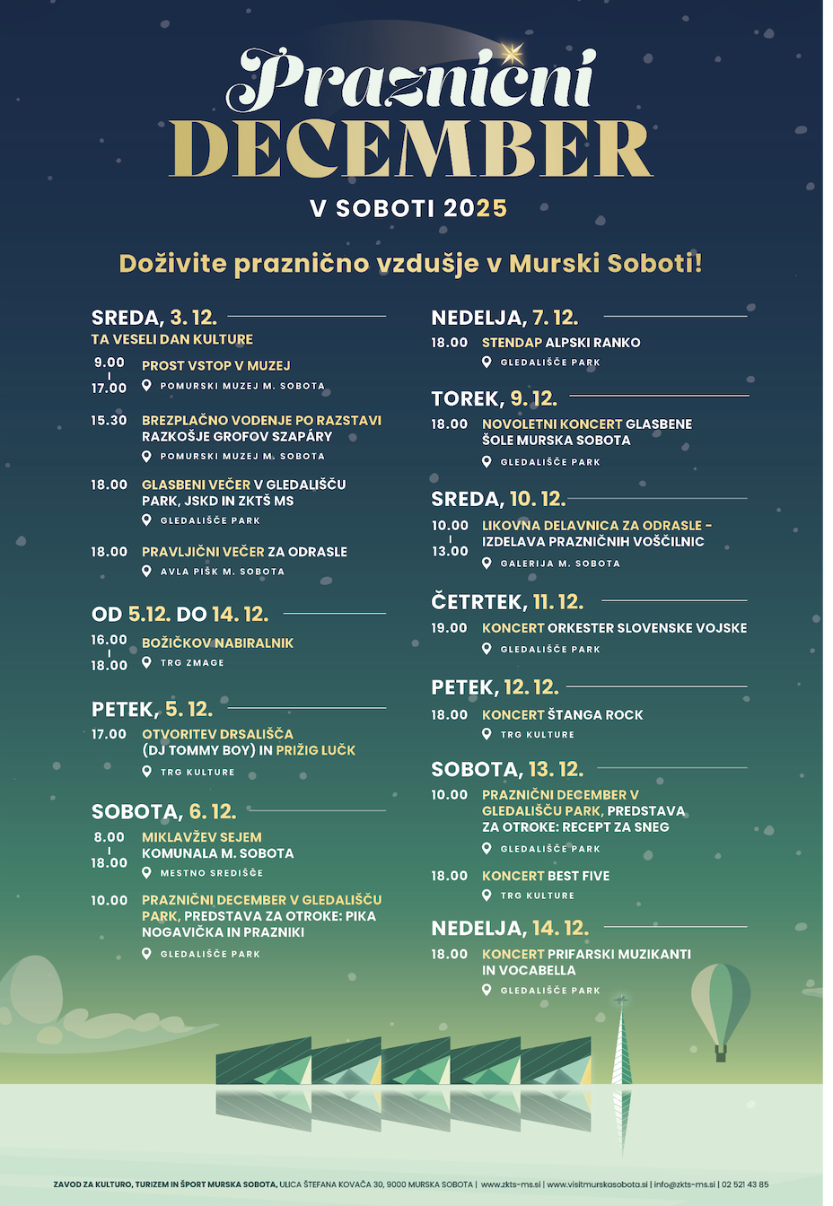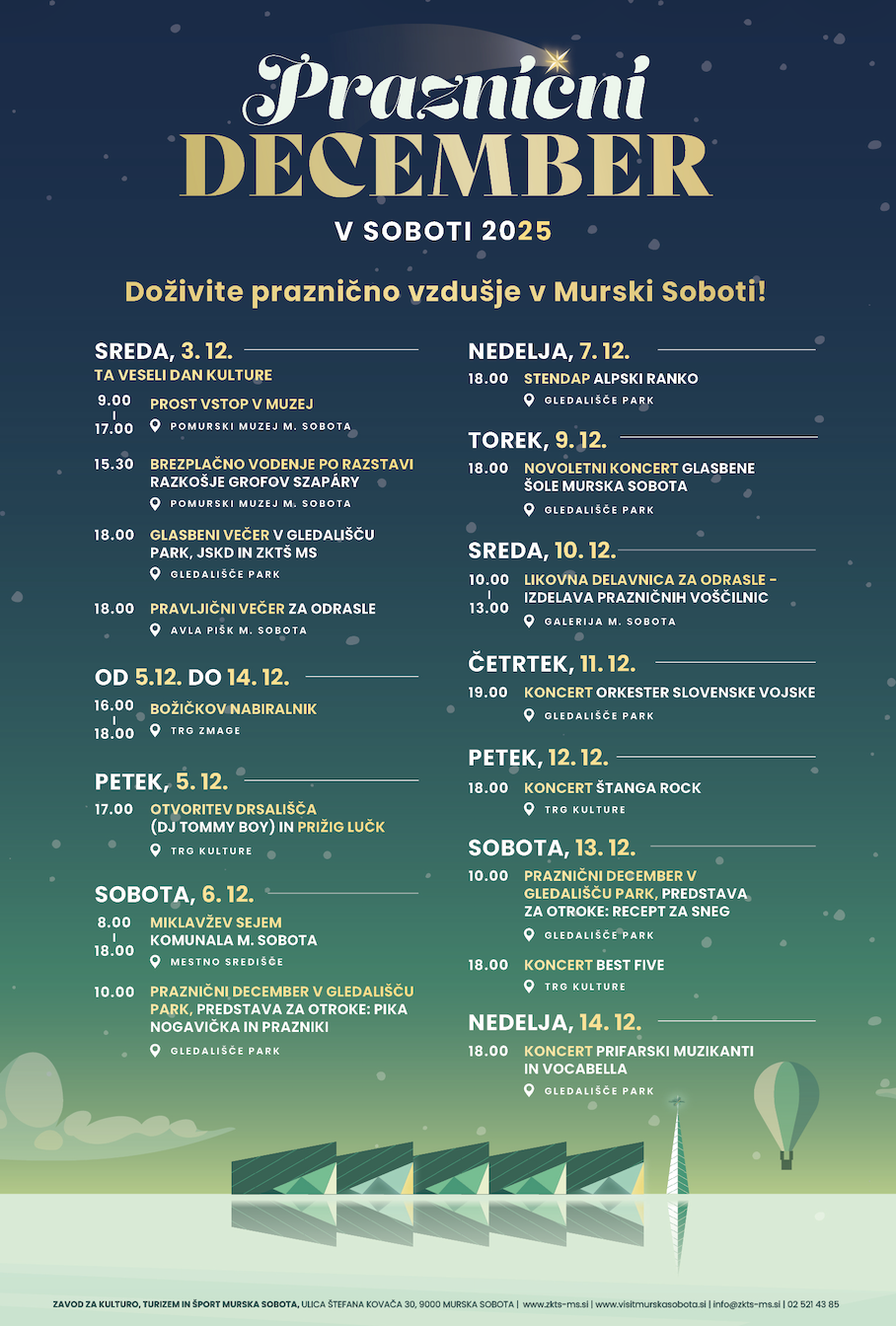 Vabljeni, da se pridružite prazničnemu dogajanju v Murski Soboti in številnih drugih krajih po Pomurju, kjer se skozi ves december prepletajo tradicija, glasba, druženje in toplina praznikov. Naj vas čarobnost naše regije pospremi v najlepše dni leta.